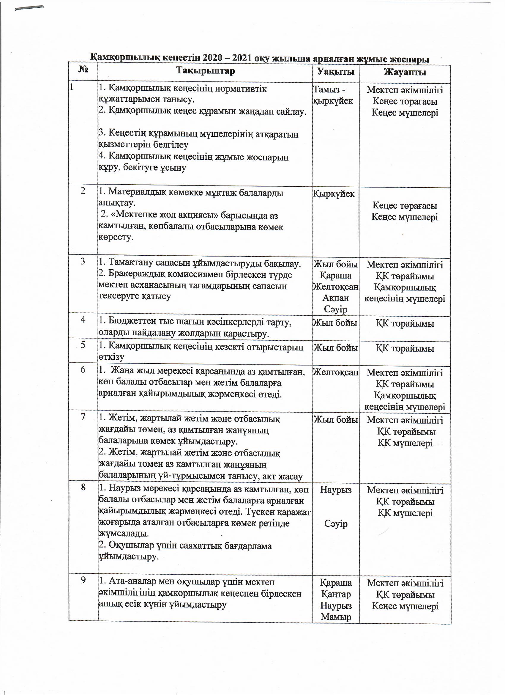 Қамқоршылық кеңестің 2020-2021 жылына арналған жұмыс жоспары