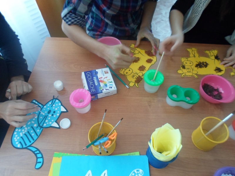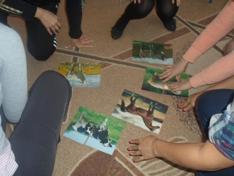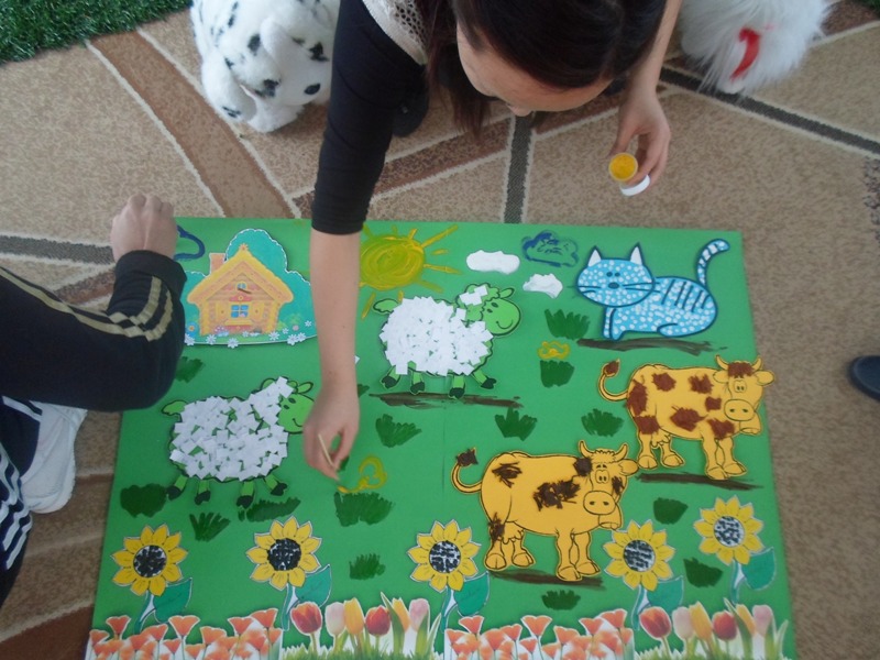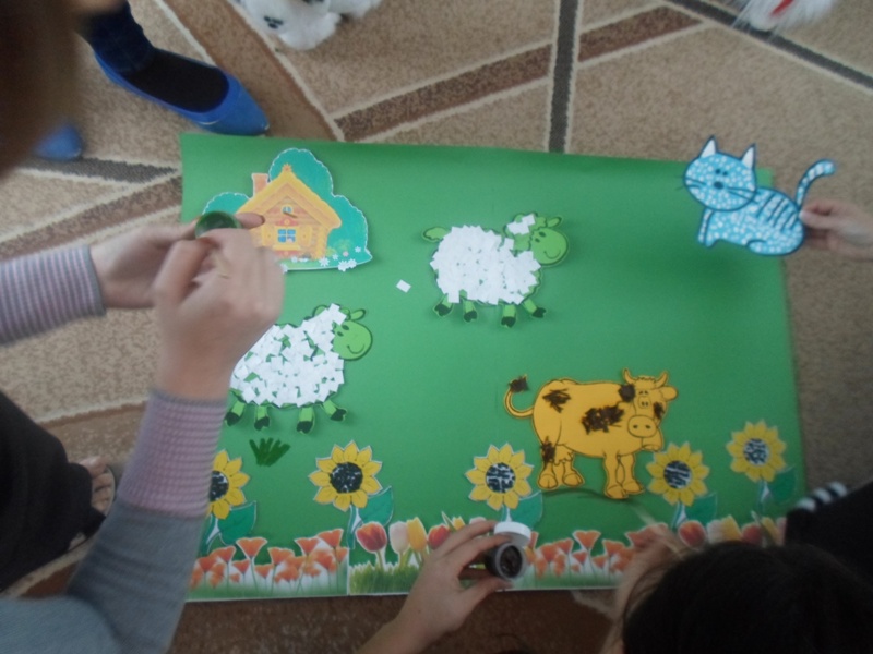 Педагог: Немного отдохнули, а теперь за работу. Разделимся на подгруппы: 1 подгруппа будет утеплять шубку овечкам,2 подгруппа-коровам, 3 подгруппа-кошкам.