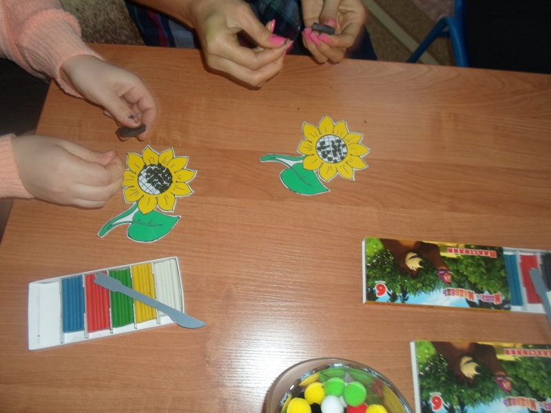 Педагог: Давайте-ка вернем все семечки на место (педагог раздает шаблоны подсолнуха, пластилин, показывает готовый образец).