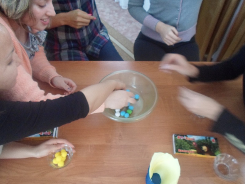 Педагог: Следующее задание, помочь кошке, корове и овечке. Приближается зима, нужно утеплить шубки нашим животным, что бы зимой они не замерзли. Только вот беда, котята играли клубочками, смешали все клубочки. Наша задача, распределить клубочки по цветам (участникам дается корзинка с клубочками и отдельно корзинки для распределения по цвету).