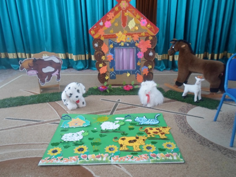 Педагог: Вот мы и приехали. Смотрите, как в деревне красиво. Вот дом бабушки, двор и ее хозяйство. Ну а теперь прочтем задание которые должны мы сделать: «Бабушка жалуется, что животные и птицы во дворе поссорились. Спор между обитателями двора произошел потому что, каждый хотел доказать, что именно он, приносит большую пользу человеку. Помогите помирить моих питомцев».