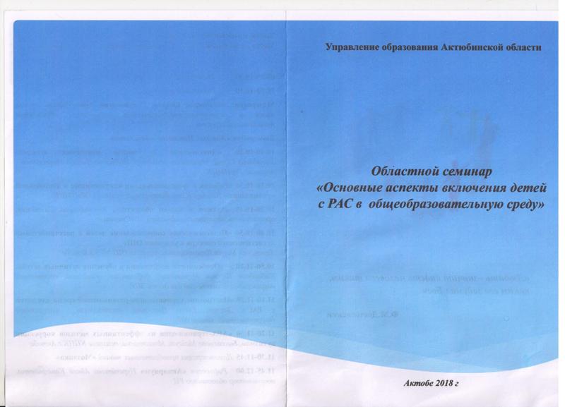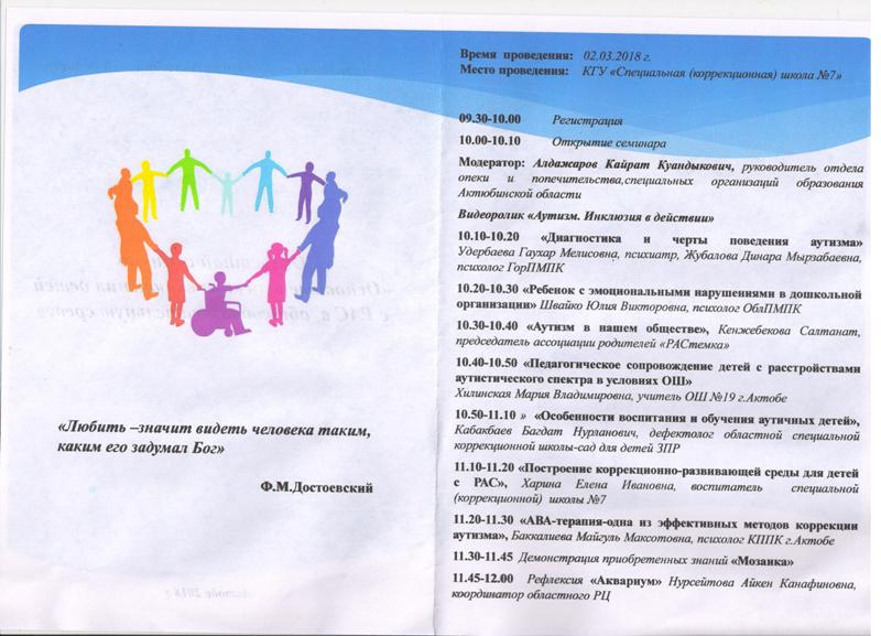 2 марта 2018 года в КГУ "Специальной (коррекционной) школе №7" прошел областной семинар на тему "Основные аспекты включения детей с РАС в общеобразовательную среду". На областном семинаре дефектолог КГУ "Областной специальной коррекционной школы-сад для детей с задержкой психического развития" Кабакбаев Багдат Нурланович выступил с темой "Особенности воспитания и обучения аутичных детей". В своем выступление Багдат Нурланович представил материалы практической работы с аутичными детьми в школе-сад для детей с ЗПР.